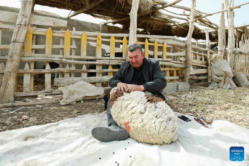 Arkin Reyim shears a sheep at his sheep pen in the Bax Mali Village of Yuli County, northwest China's Xinjiang Uygur Autonomous Region, March 29, 2023. (Xinhua/Hao Zhao)