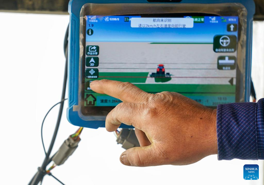 Arkin Reyim drives a tractor with the Beidou navigation system at a cotton field in the Bax Mali Village of Yuli County, northwest China's Xinjiang Uygur Autonomous Region, April 17, 2023. (Photo by Wang Zhipeng/Xinhua)