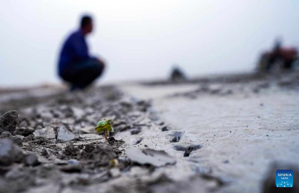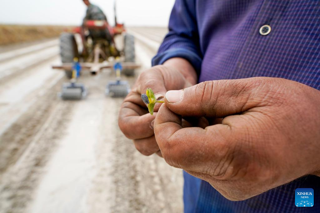 Arkin Reyim inspects the growing condition of cotton shoot in the Bax Mali Village of Yuli County, northwest China's Xinjiang Uygur Autonomous Region, April 21, 2023.?(Xinhua/Zhao Ge)
