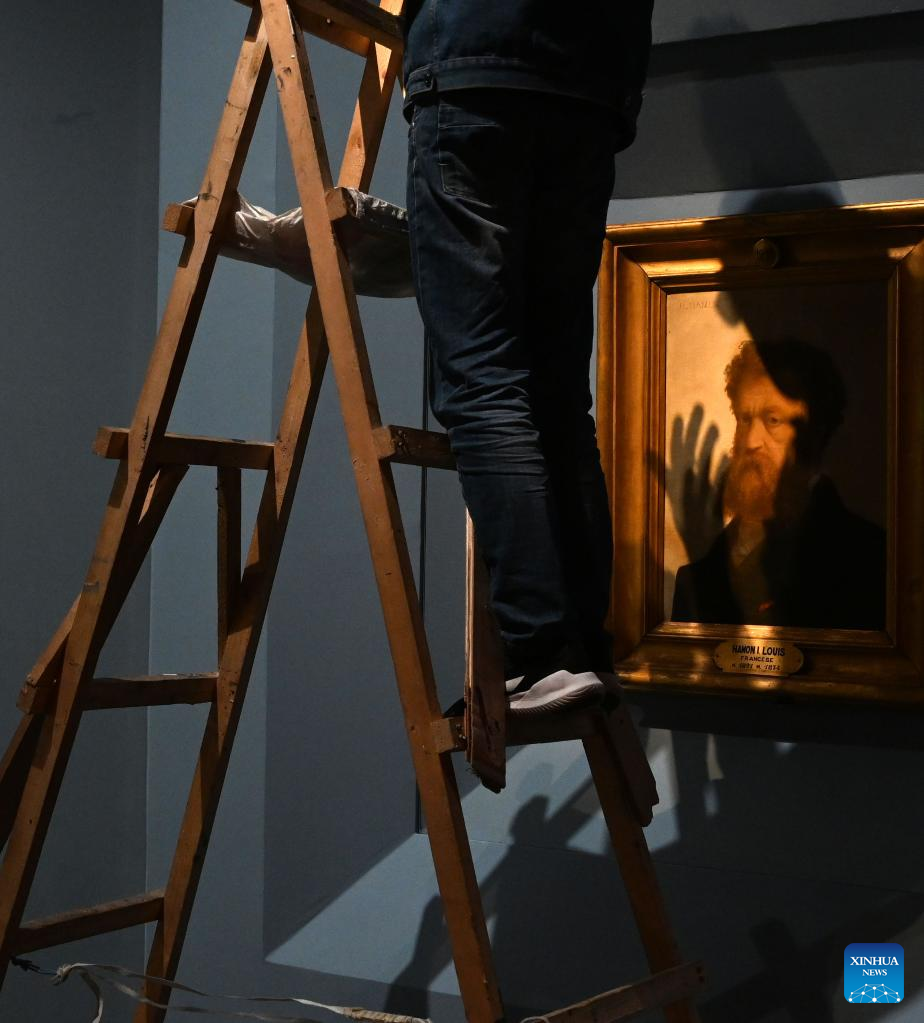 Staff members work for the exhibition of Self-Portrait Masterpieces from the Uffizi Galleries Collections at the National Museum of China in Beijing, capital of China, April 26, 2023. The Self-Portrait Masterpieces from the Uffizi Galleries Collections was opened to the public on Thursday at the National Museum of China in Beijing and will last until Sept. 10. (Xinhua/Jin Liangkuai)