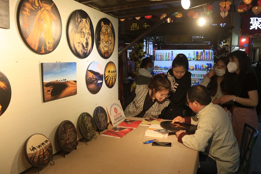 Tourists purchase wood engraving paintings at a night market in Dunhuang, northwest China's Gansu Province. (Photo/Zhang Xiaoliang)