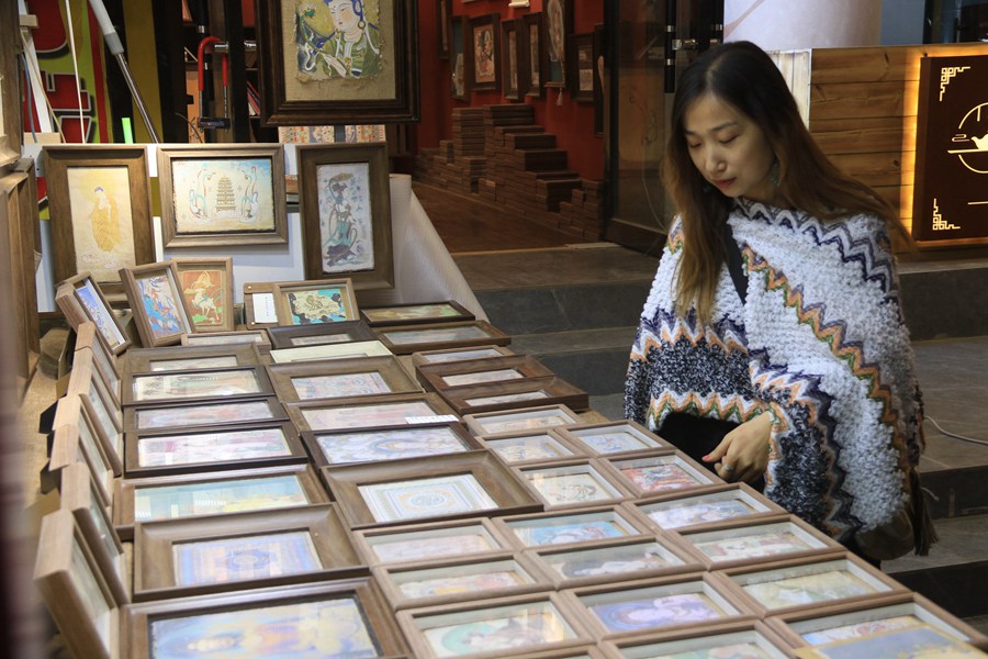 A tourist purchases clay paintings at a night market in Dunhuang, northwest China's Gansu Province. (Photo/Zhang Xiaoliang)