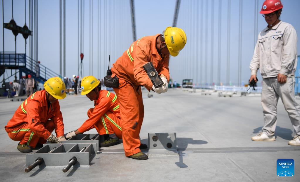 Workers assemble a box girder at the construction site of Lingdingyang bridge, which is part of the Shenzhen-Zhongshan link in south China's Guangdong Province, April 28, 2023. Lingdingyang bridge, a key part of the Shenzhen-Zhongshan link, got its final segments joined on Friday.