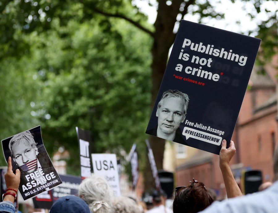 Supporters of Julian Assange are seen in front of the British Home Office in London, Britain, May 17, 2022. (Xinhua/Li Ying)