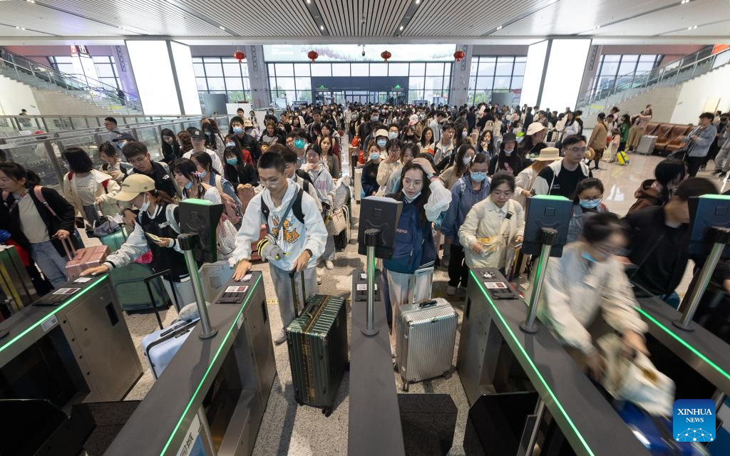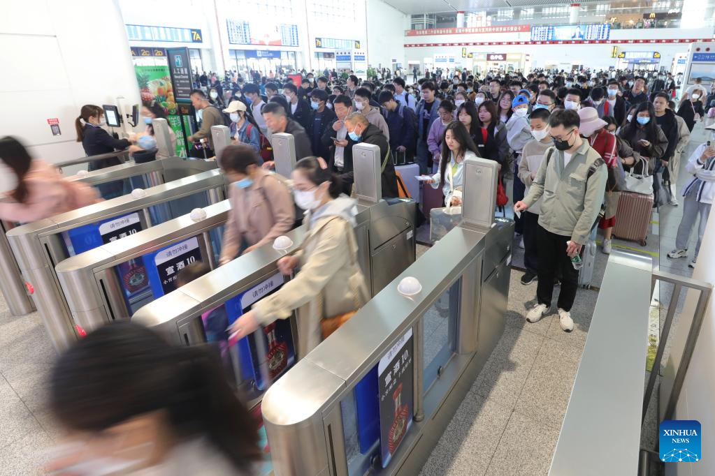 Passengers have their tickets checked at the waiting hall of a railway station in Huzhou, east China's Zhejiang Province, April 29, 2023. A travel rush is on as the country ushers in the 5-day Labor Day holiday on Saturday. (Photo by Yi Fan/Xinhua)