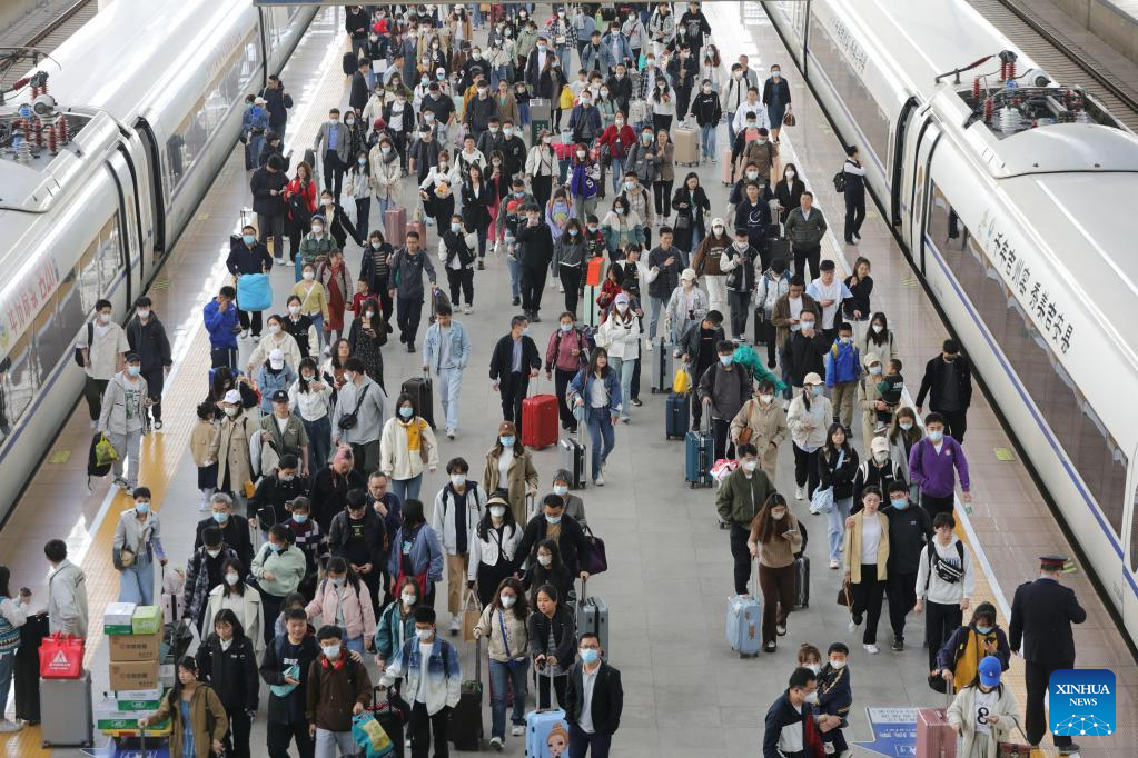 (230429) -- XUZHOU, April 29, 2023 (Xinhua) -- Passengers are pictured at the platform of the Xuzhou East Railway Station in Xuzhou, east China's Jiangsu Province, April 29, 2023. A travel rush is on as the country ushers in the 5-day Labor Day holiday on Saturday. (Xinhua/Mao Jun)