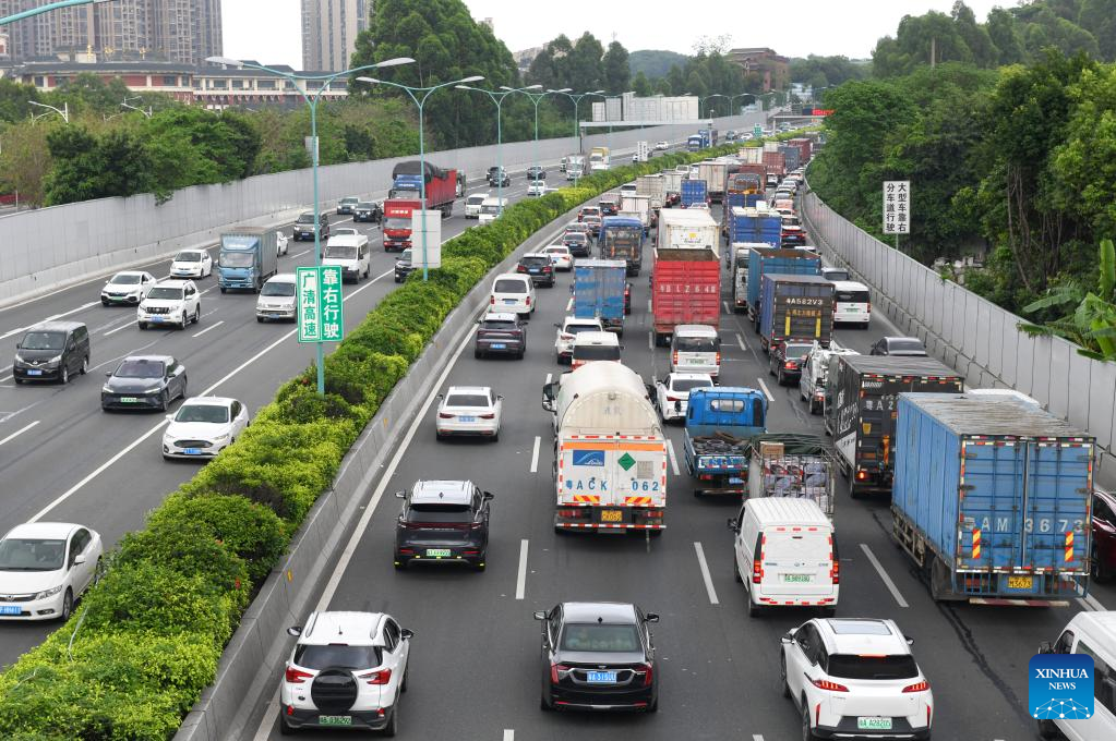 (230429) -- GUANGZHOU, April 29, 2023 (Xinhua) -- Heavy traffic is pictured on the expressway surrounding the city of Guangzhou, south China's Guangdong Province, April 29, 2023. A travel rush is on as the country ushers in the 5-day Labor Day holiday on Saturday. (Xinhua/Lu Hanxin)