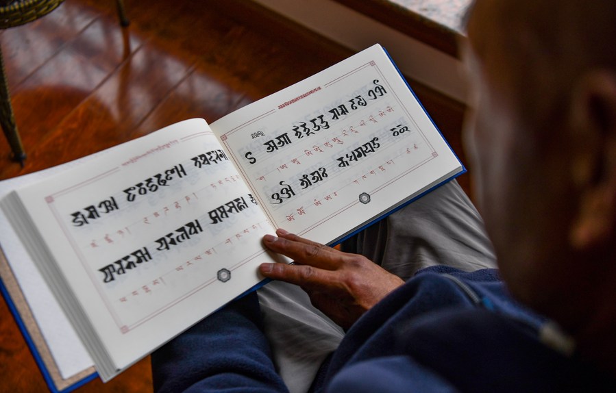 Gyumey Tsultrim checks a reference book in Sanskrit and Tibetan in Lhasa, southwest China's Tibet Autonomous Region, April 19, 2023. (Xinhua/Jigme Dorje)