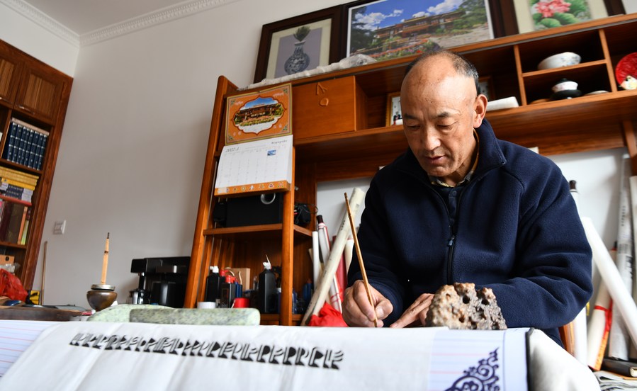Gyumey Tsultrim writes Sanskrit calligraphy at home in Lhasa, southwest China's Tibet Autonomous Region, April 19, 2023. (Xinhua/Jigme Dorje)