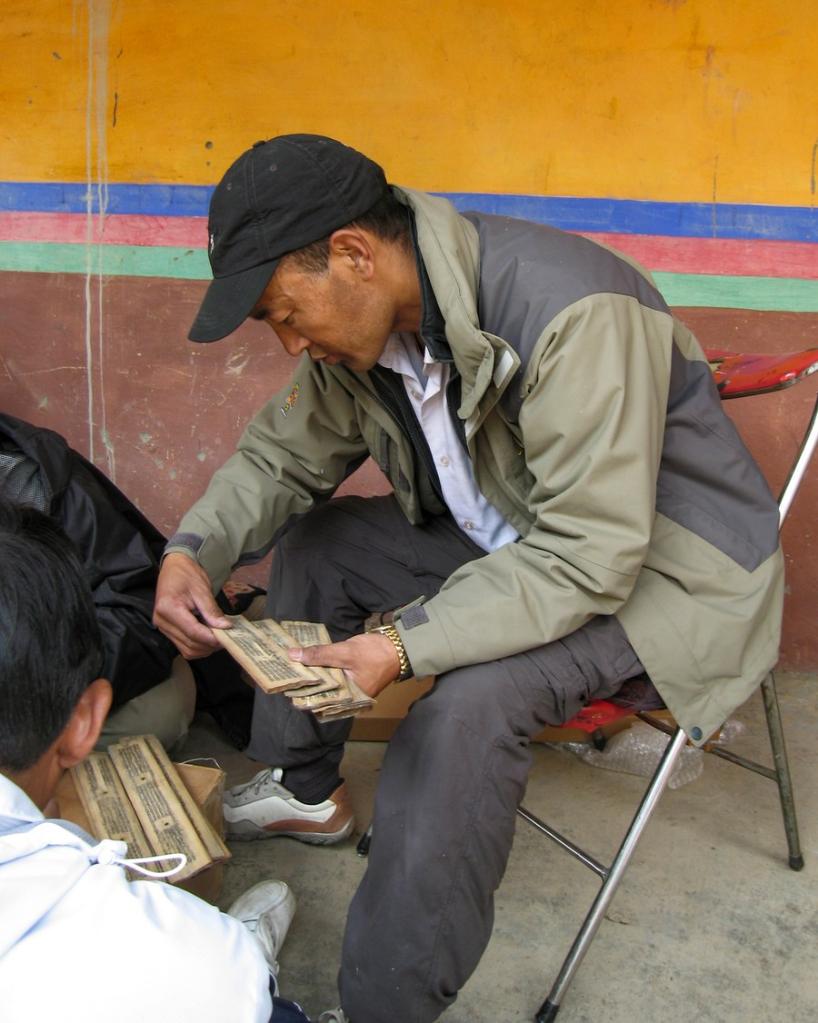This file photo taken on July 27, 2008 shows Gyumey Tsultrim observing palm-leaf manuscripts of Buddhist sutras in southwest China's Tibet Autonomous Region. (Xinhua)