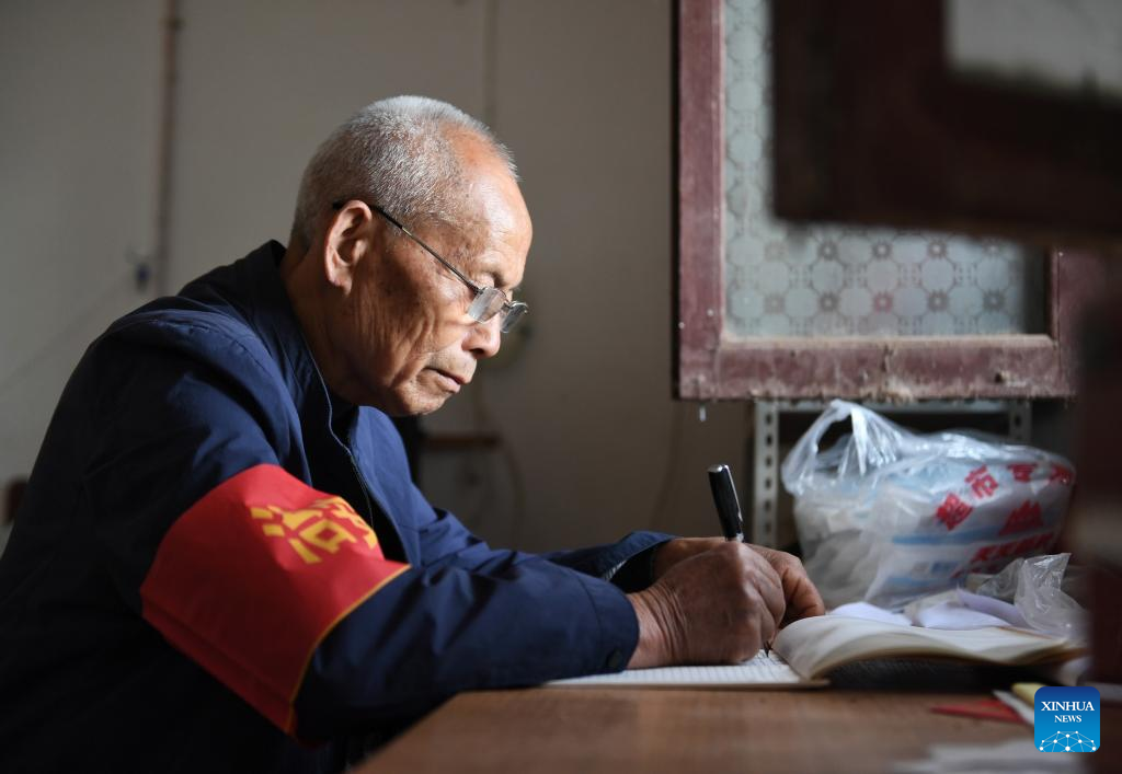 Wu Zhongfu keeps records after patrolling the Wofo Yard in Anyue County, southwest China's Sichuan Province, April 3, 2023. Wu Zhongfu, 73-year-old, has been protecting and conserving the Buddhist statues and stone carvings of Buddhist scriptures from Tang Dynasty (618-907) for 41 years in the Wofo (meaning sleeping Buddha) Yard of Anyue County in Sichuan Province.