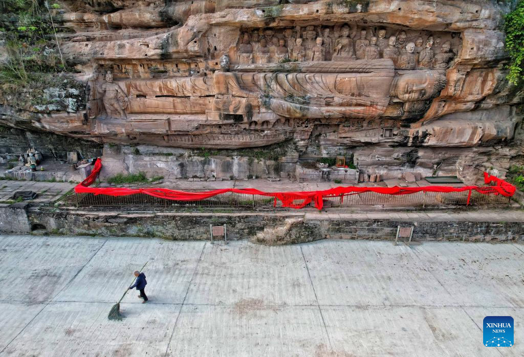 This aerial photo taken on April 3, 2023 shows Wu Zhongfu cleaning the Wofo Yard in Anyue County, southwest China's Sichuan Province. Wu Zhongfu, 73-year-old, has been protecting and conserving the Buddhist statues and stone carvings of Buddhist scriptures from Tang Dynasty (618-907) for 41 years in the Wofo (meaning sleeping Buddha) Yard of Anyue County in Sichuan Province.