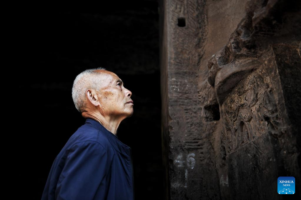 Wu Zhongfu patrols in a grotto in Anyue County, southwest China's Sichuan Province, April 3, 2023. Wu Zhongfu, 73-year-old, has been protecting and conserving the Buddhist statues and stone carvings of Buddhist scriptures from Tang Dynasty (618-907) for 41 years in the Wofo (meaning sleeping Buddha) Yard of Anyue County in Sichuan Province.
