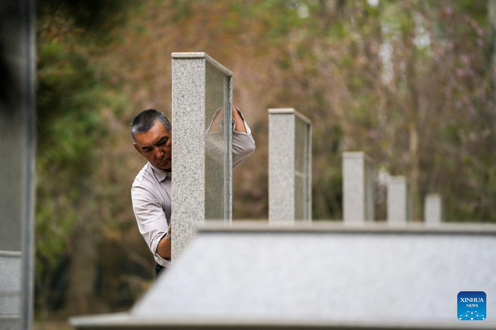 Eniwar Emer wipes a tombstone in the Yecheng Martyrs Cemetery in Yecheng, northwest China's Xinjiang Uygur Autonomous Region, April 16, 2023.