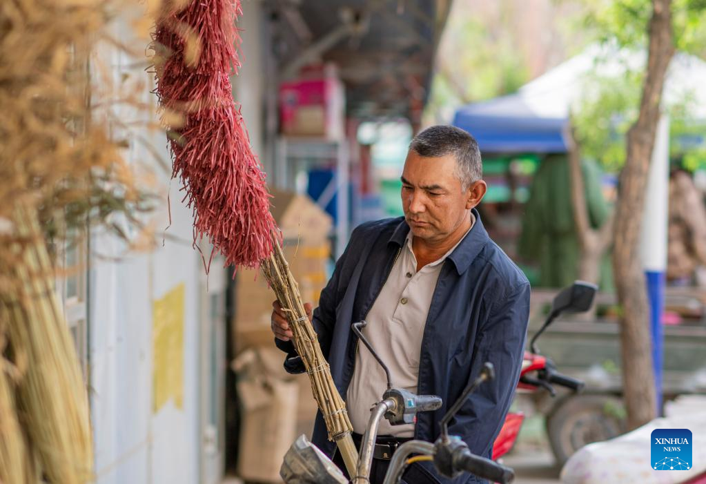 Eniwar Emer picks a broom to sweep the cemetery at a local market in Yecheng, northwest China's Xinjiang Uygur Autonomous Region, April 16, 2023.