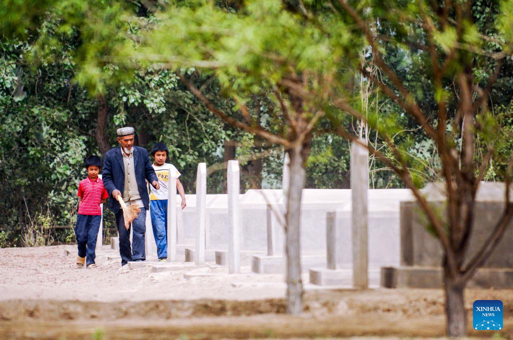 This file photo taken on April 30, 2011 shows Emer Yit, along with his grandchildren, sweeping the tombs in the Yecheng Martyrs Cemetery in Yecheng, northwest China's Xinjiang Uygur Autonomous Region.