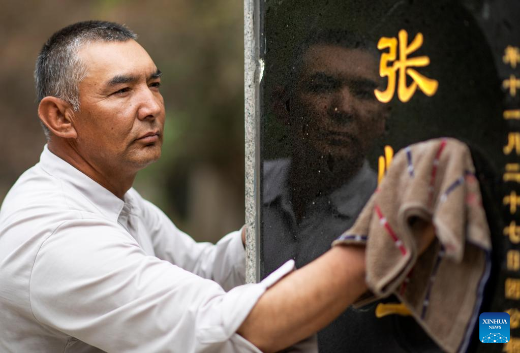 Eniwar Emer wipes a tombstone in the Yecheng Martyrs Cemetery in Yecheng, northwest China's Xinjiang Uygur Autonomous Region, April 16, 2023.