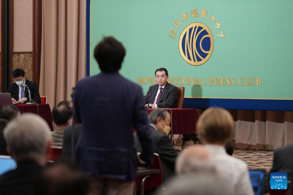 Chinese Ambassador to Japan Wu Jianghao speaks during a press conference at the Japan National Press Club in Tokyo, Japan, April 28, 2023. Japan should have a correct understanding of China from the root, adopt strategic independence, understand the trend of the times, and truly promote the stable development of bilateral relations with a constructive attitude, Chinese Ambassador Wu Jianghao said. (Xinhua/Zhang Xiaoyu)