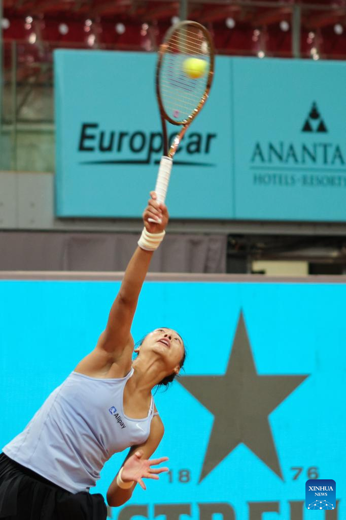 Zheng Qinwen of China serves during the women's singles round of 32 match against Ekaterina Alexandrova of Russia at the Madrid Open tennis tournament in Madrid, Spain, April 30, 2023. (Xinhua/Meng Dingbo)