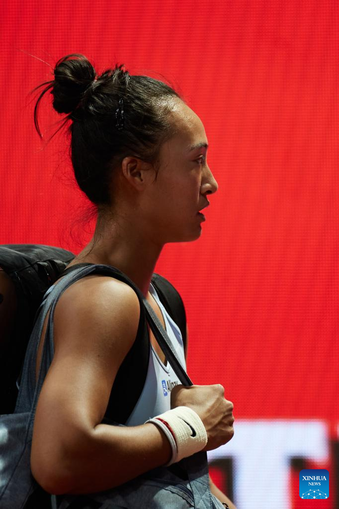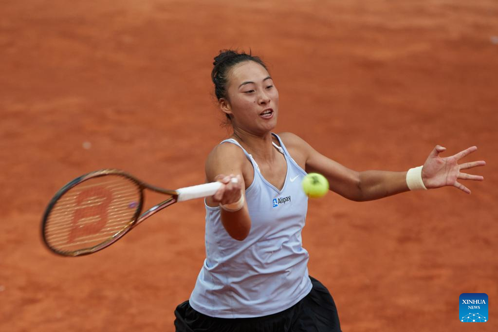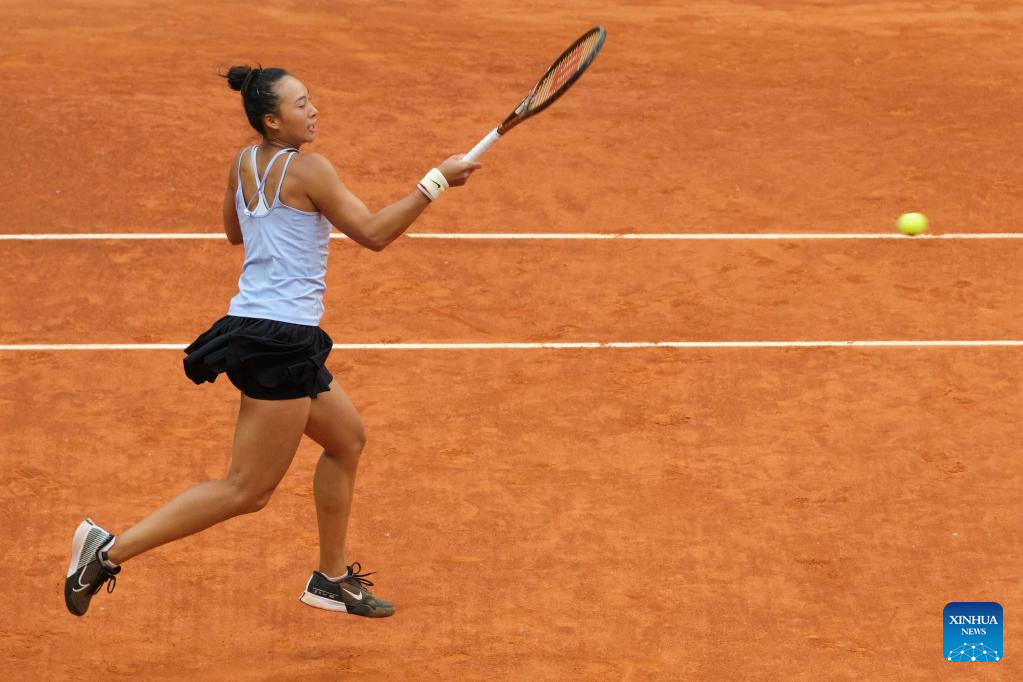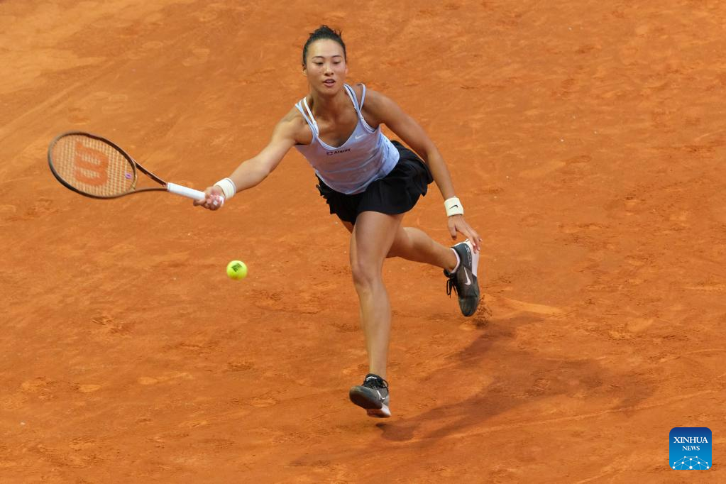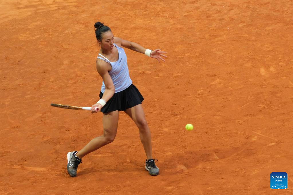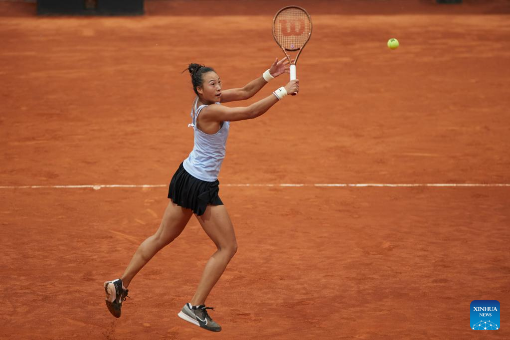Zheng Qinwen of China returns the ball during the women's singles round of 32 match against Ekaterina Alexandrova of Russia at the Madrid Open tennis tournament in Madrid, Spain, April 30, 2023. (Xinhua/Meng Dingbo)