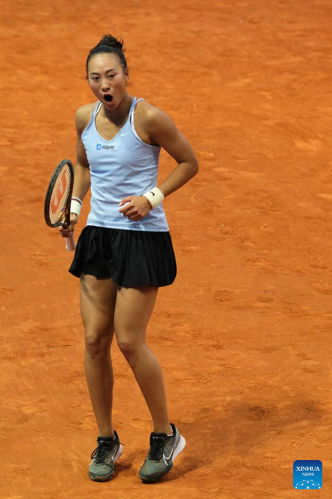 Zheng Qinwen of China celebrates during the women's singles round of 32 match against Ekaterina Alexandrova of Russia at the Madrid Open tennis tournament in Madrid, Spain, April 30, 2023. (Xinhua/Meng Dingbo)