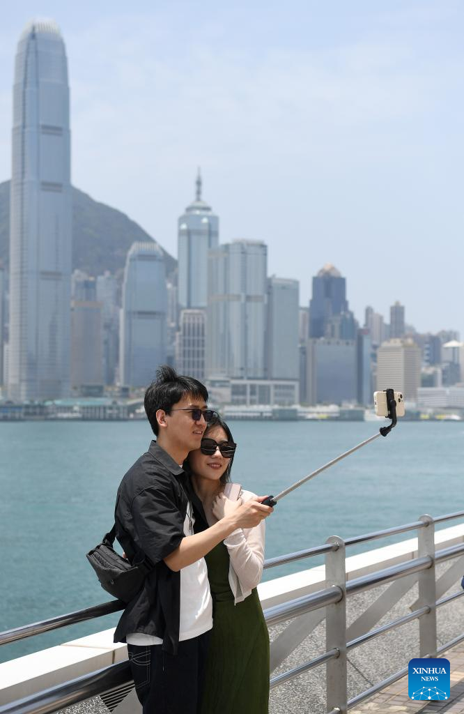 Tourists take selfies at Tsim Sha Tsui in Hong Kong, south China, April 30, 2023. Hong Kong's economy grew by 2.7 percent year on year in the first quarter of 2023, reversing a four-quarter-long contraction last year, according to official data announced Tuesday. (Xinhua/Chen Duo)