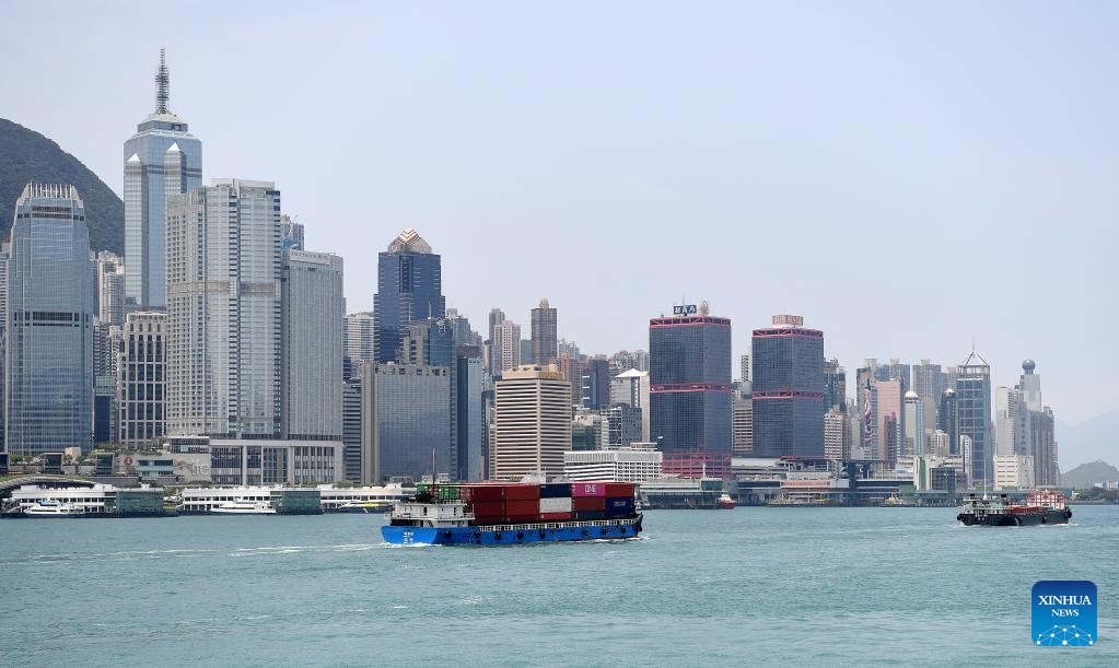 A container barge sails in the Victoria Harbor in Hong Kong, south China, April 30, 2023. Hong Kong's economy grew by 2.7 percent year on year in the first quarter of 2023, reversing a four-quarter-long contraction last year, according to official data announced Tuesday. (Xinhua/Chen Duo)
