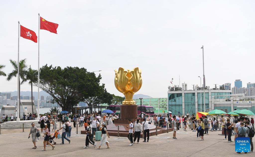 Tourists visit the Golden Bauhinia Square in Hong Kong, south China, April 30, 2023. Hong Kong's economy grew by 2.7 percent year on year in the first quarter of 2023, reversing a four-quarter-long contraction last year, according to official data announced Tuesday. (Xinhua/Chen Duo)