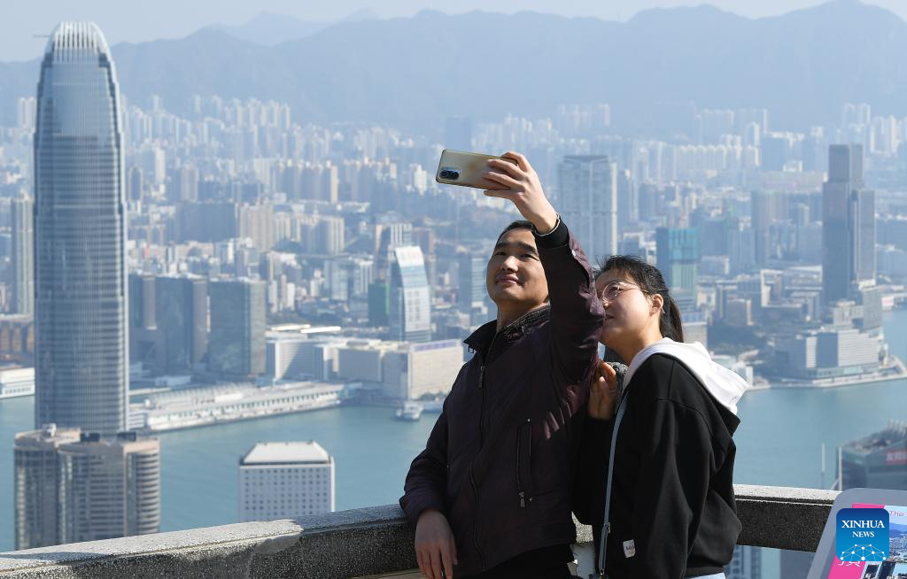 Tourists take selfies at Victoria Peak in Hong Kong, south China, Feb. 23, 2023. Hong Kong's economy grew by 2.7 percent year on year in the first quarter of 2023, reversing a four-quarter-long contraction last year, according to official data announced Tuesday. (Xinhua/Chen Duo)