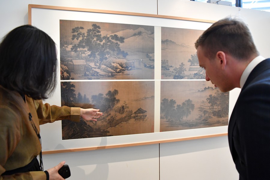 Participants visit an exhibition of paintings of the Song Dynasty (960-1279) in Geneva, Switzerland, on April 20, 2023. (Xinhua/Lian Yi)