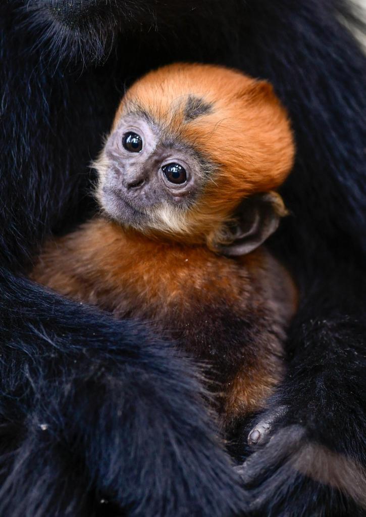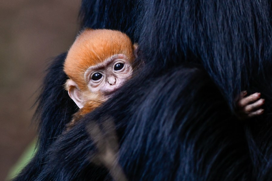This photo taken on April 30, 2023 shows a Francois' leaf monkey cub in the Mayanghe National Nature Reserve in Guizhou Province, southwest China. (Xinhua/Yang Wenbin)