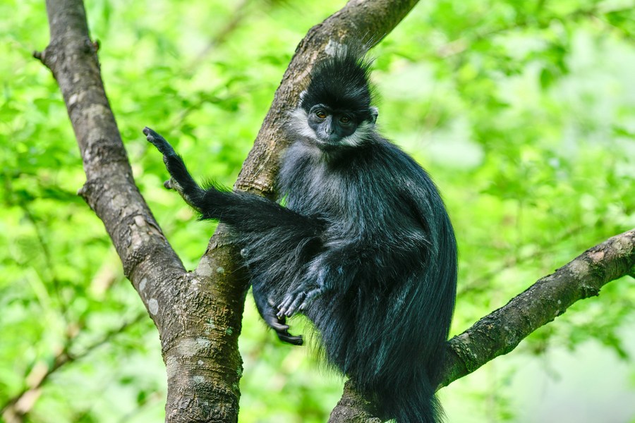 This photo taken on May 1, 2023 shows a Francois' leaf monkey in the Mayanghe National Nature Reserve in Guizhou Province, southwest China. (Xinhua/Yang Wenbin)