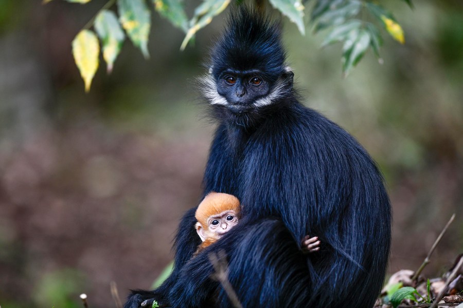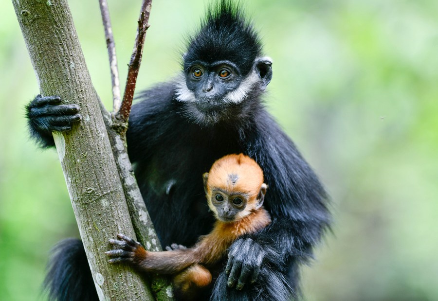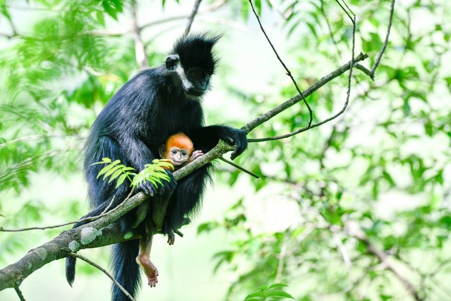 A Francois' leaf monkey is seen with a cub in the Mayanghe National Nature Reserve in Guizhou Province, southwest China, April 30, 2023. (Xinhua/Yang Wenbin)