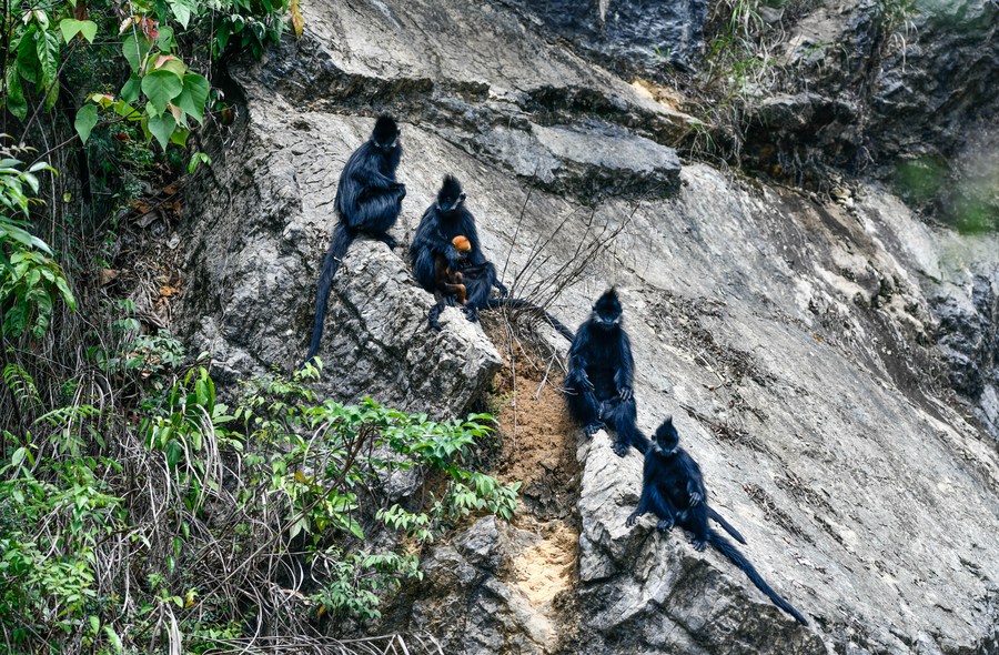 Francois' leaf monkeys and a cub are seen in the Mayanghe National Nature Reserve in Guizhou Province, southwest China, May 1, 2023. (Xinhua/Yang Wenbin)