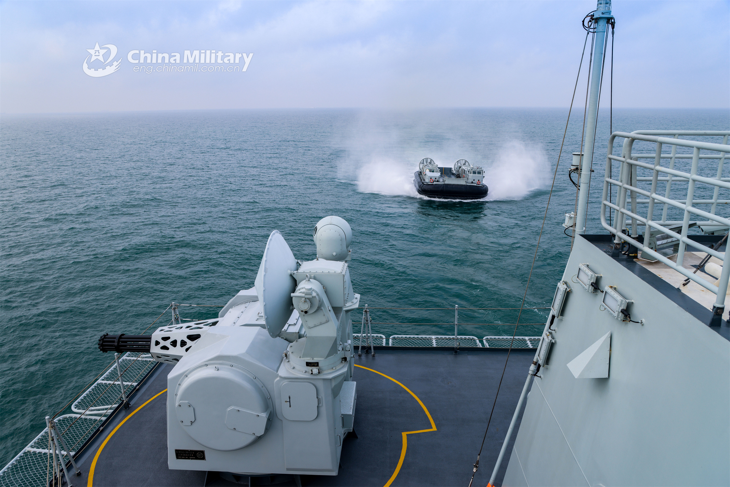 An air-cushioned landing craft attached to a naval landing ship flotilla under the PLA Southern Theater Command sails in coordination with a warship during a maritime real-combat training exercise recently. (eng.chinamil.com.cn/Photo by Qiao Chenxi)