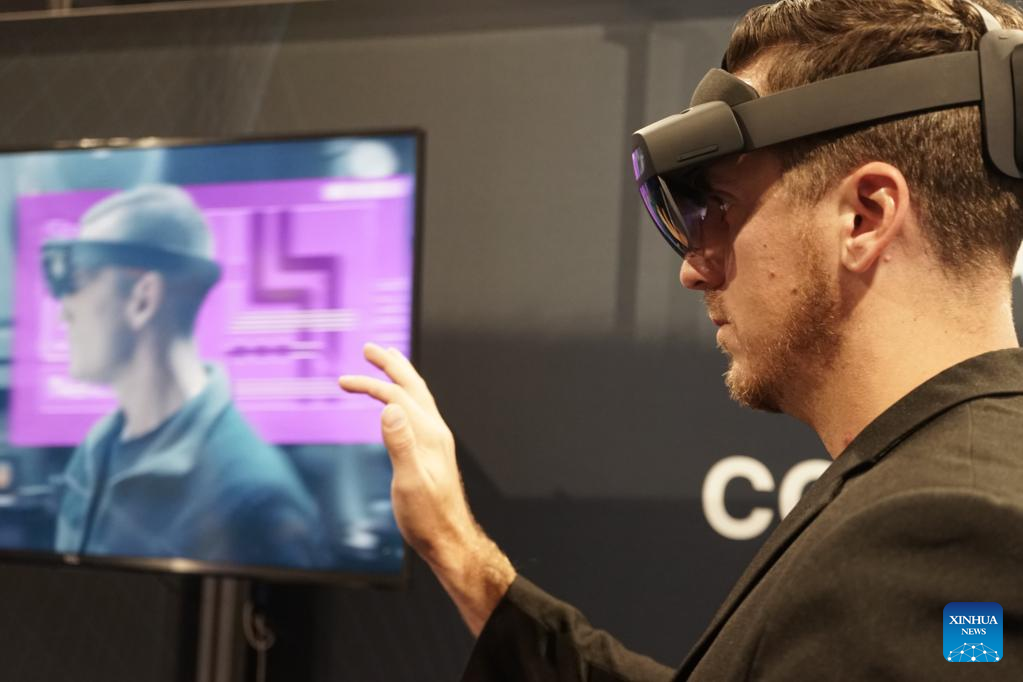 A man tests 3D glasses during the Space Tech Expo USA 2023 in Long Beach, California, the United States, on May 3, 2023. The premier space tech expo is held in Long Beach in Southern California on Wednesday and Thursday, featuring the latest cutting-edge innovations, technologies and products in the space industry. (Photo by Zeng Hui/Xinhua)