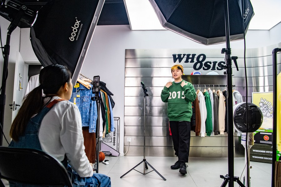 A young entrepreneur promotes products via livestreaming at Yichang film park, a popular scenic spot and a business incubation base transformed from former industrial site, in Yuzhong District, southwest China's Chongqing, Sept. 27, 2022. (Xinhua/Tang Yi)