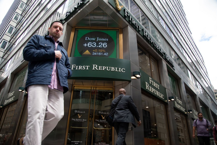 People walk past a branch of First Republic Bank in New York, the United States, on May 1, 2023. (Photo by Michael Nagle/Xinhua)