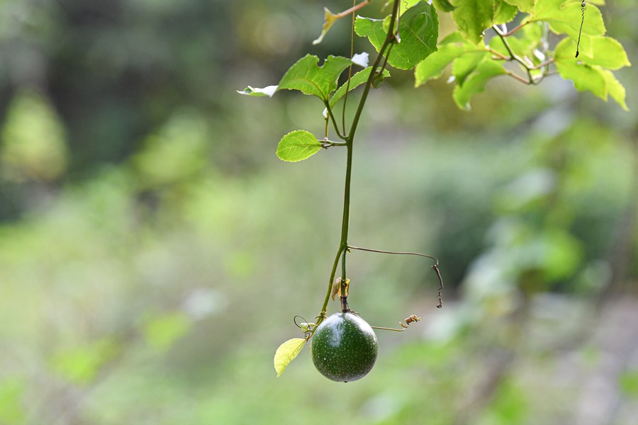 Photo taken on Nov. 18, 2021 shows the Passiflora edulis (passion fruit) in Hainan Tropical Botanical Garden in Danzhou City, south China's Hainan Province. (Xinhua/Pu Xiaoxu)