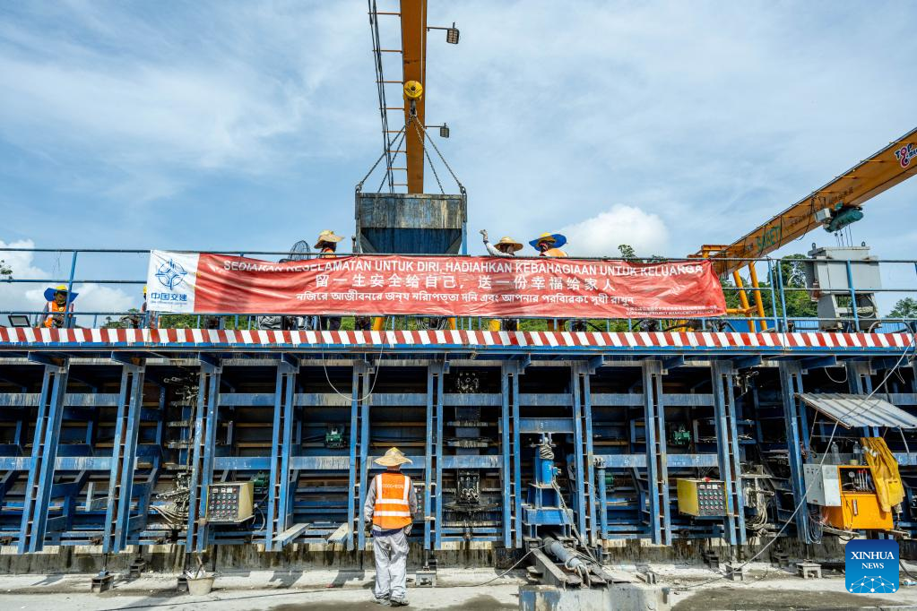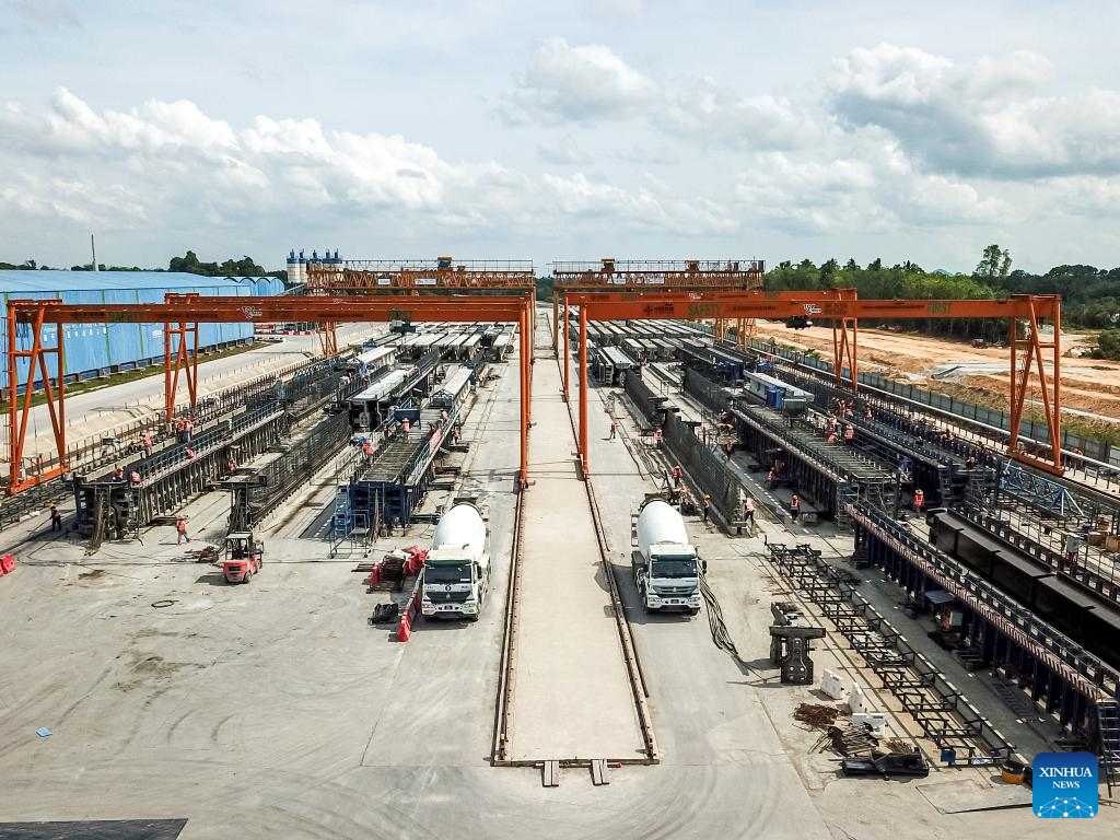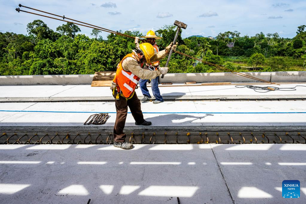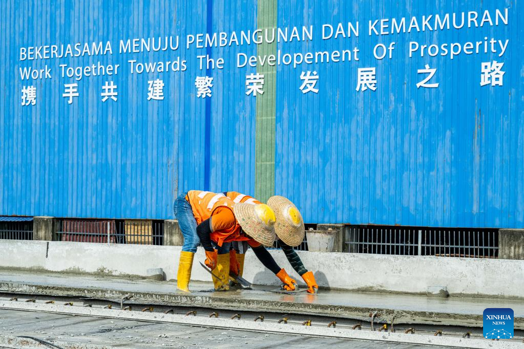 People work at a construction site of the East Coast Rail Link (ECRL), a major infrastructure project under the Belt and Road Initiative (BRI) in Kelantan, Malaysia, April 26, 2023. (Xinhua/Zhu Wei)