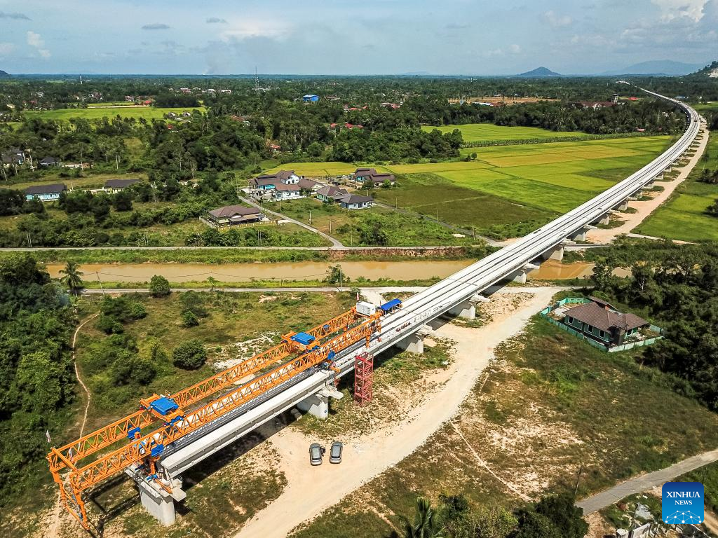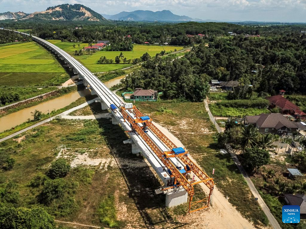 This aerial photo taken on April 26, 2023 shows a construction site of the East Coast Rail Link (ECRL), a major infrastructure project under the Belt and Road Initiative (BRI) in Kelantan, Malaysia. (Xinhua/Zhu Wei)