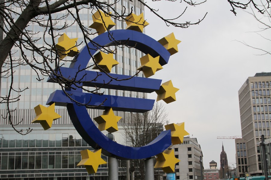This photo taken on Feb. 24, 2023 shows the Euro sculpture in Frankfurt, Germany. (Xinhua/Shan Weiyi)