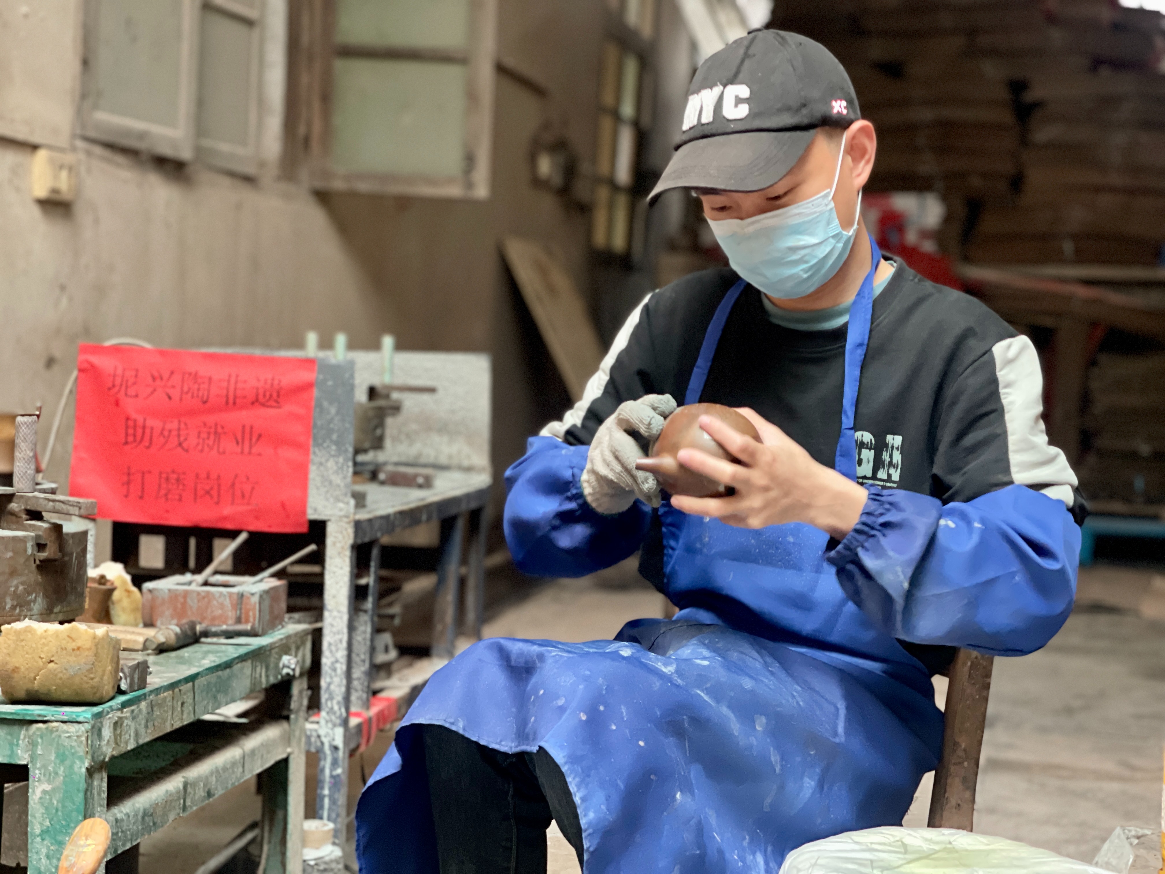 An employee works on Nixing pottery ware at a workshop in Qinzhou city, south China's Guangxi Zhuang Autonomous Region. (People's Daily Online/Zhou Jingyuan)