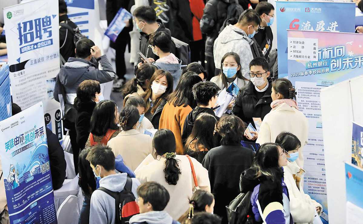 Students look for jobs at a career fair for graduates at Southeast University in Nanjing, Jiangsu province, on April 16. [Photo by LIU LI/FOR CHINA DAILY]