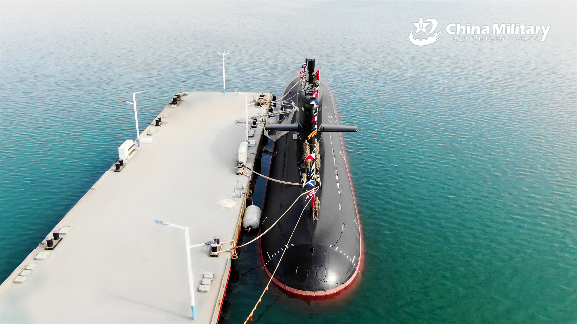 Sailors assigned to a submarine flotilla of the navy under the PLA Northern Theater Command hold a ceremony to celebrate the PLA Navy's 74th birthday in a military port on April 23, 2023. (eng.chinamil.com.cn/Photo by Wu Haodong)
