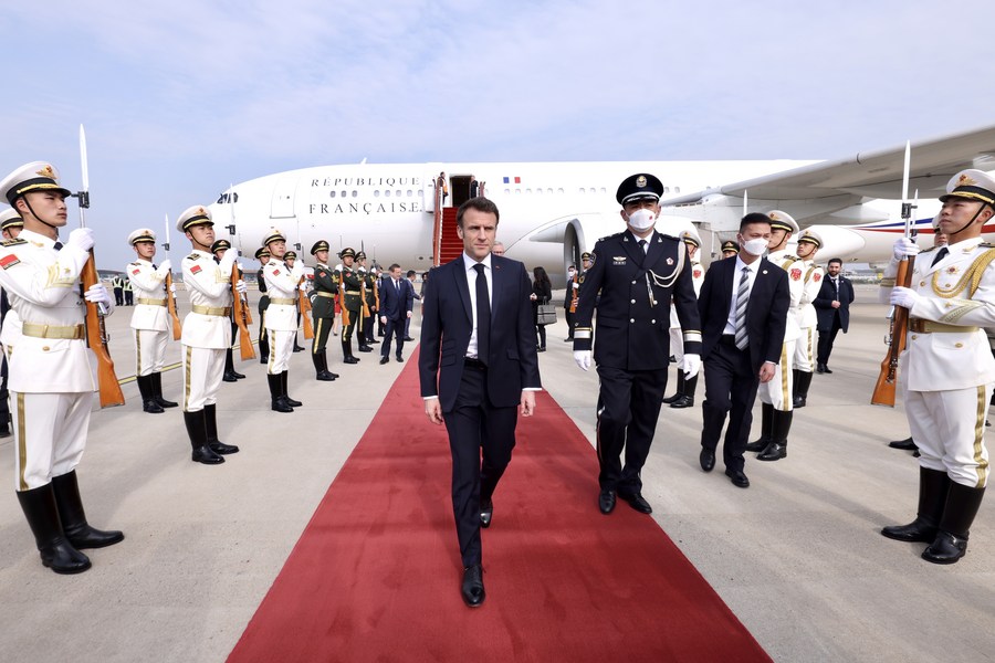 French President Emmanuel Macron arrives at Beijing Capital International Airport in Beijing, capital of China, April 5, 2023. (Xinhua/Liu Bin)