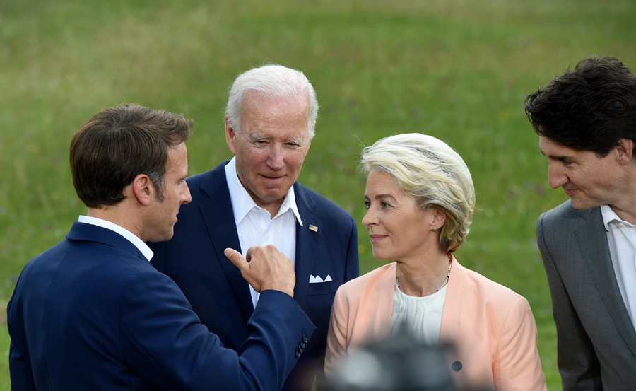 (From L to R) French President Emmanuel Macron, U.S. President Joe Biden, European Commission President Ursula von der Leyen and Canadian Prime Minister Justin Trudeau are pictured during the Group of Seven (G7) Summit in Schloss Elmau in south Germany's Bavarian Alps on June 26, 2022. (Xinhua/Guo Chen)
