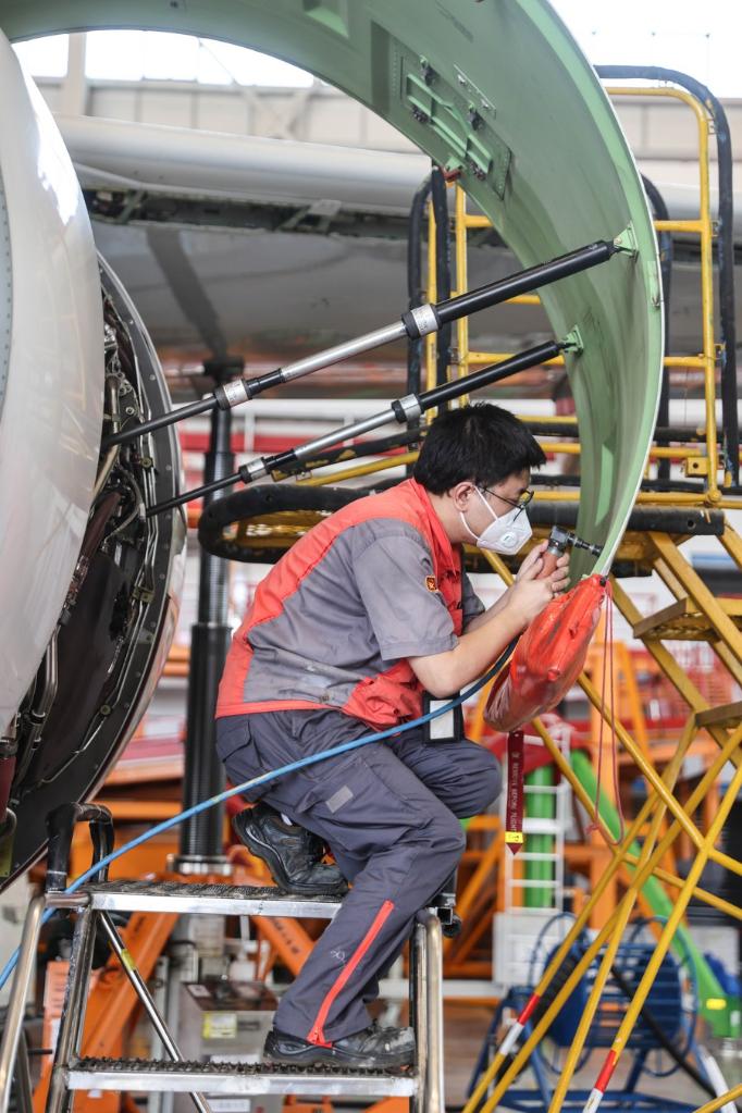 A worker of Grand China Aviation Maintenance Co., Ltd. (GCAM) maintains an airplane in Haikou, capital of south China's Hainan Province, May 5, 2023. (Xinhua/Zhang Liyun)