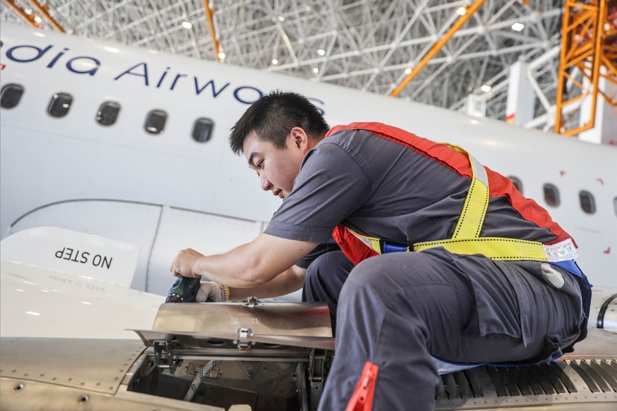 Workers of Grand China Aviation Maintenance Co., Ltd. (GCAM) maintain an airplane in Haikou, capital of south China's Hainan Province, May 5, 2023. (Xinhua/Zhang Liyun)