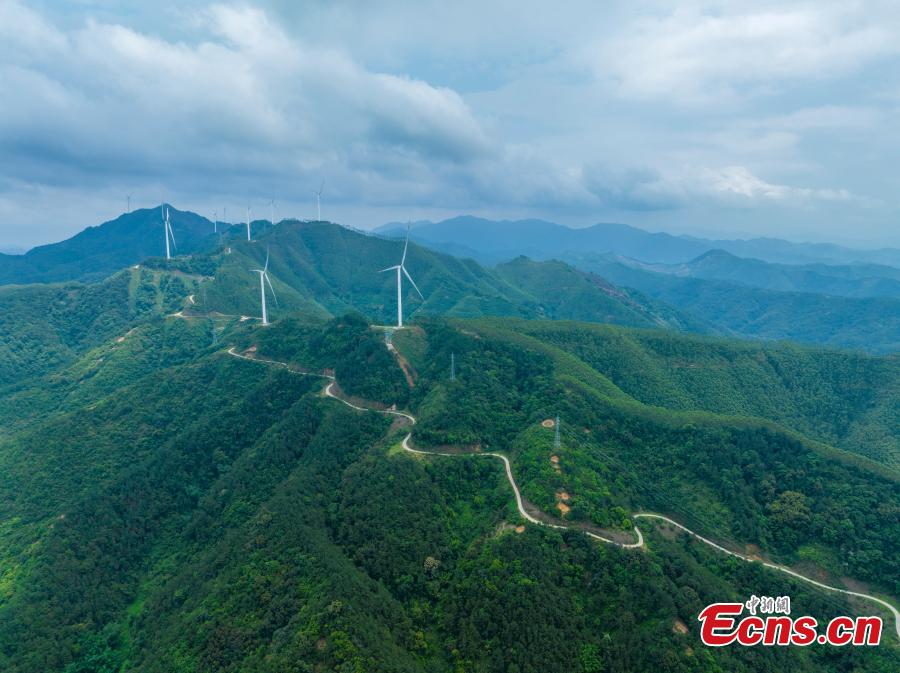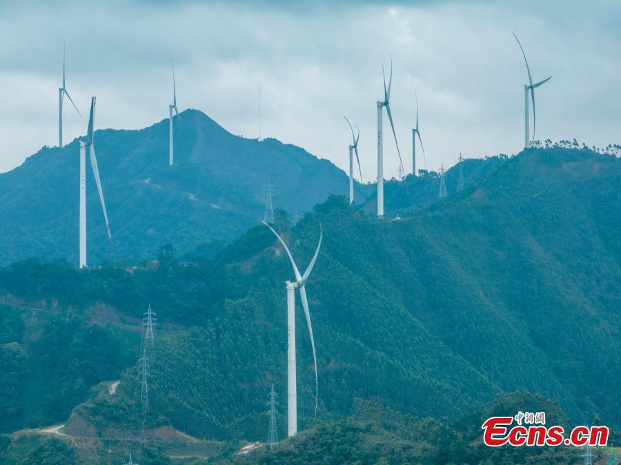 Wind turbines on mountains whirl to generate electricity in Wuzhou, south China's Guangxi Zhuang Autonomous Region. Guangxi has built windfarms to promote green and clean energy development. (Photo: China News Service/He Wenhua)